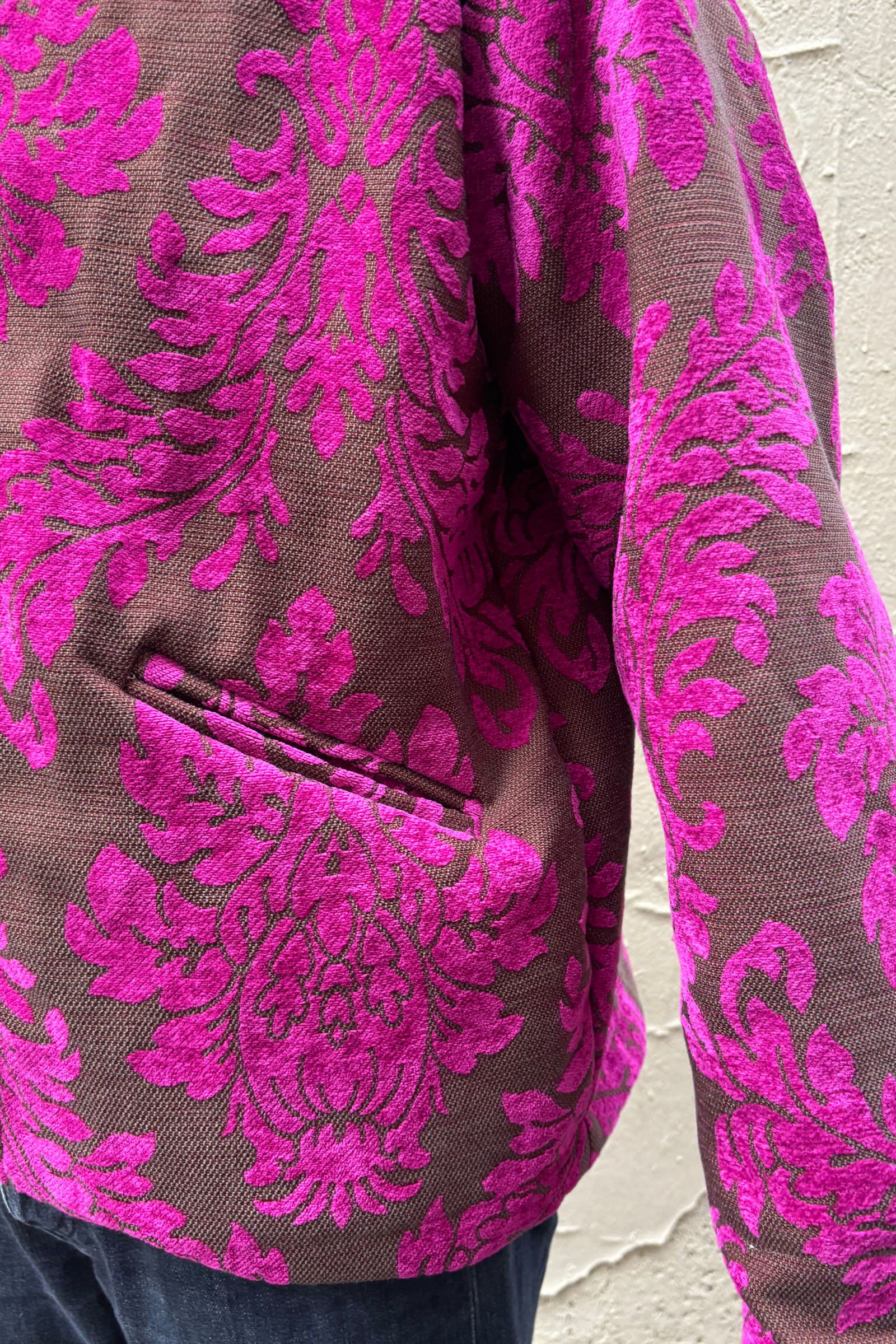 - Fabric: Upcycled jacquard upholstery fabric